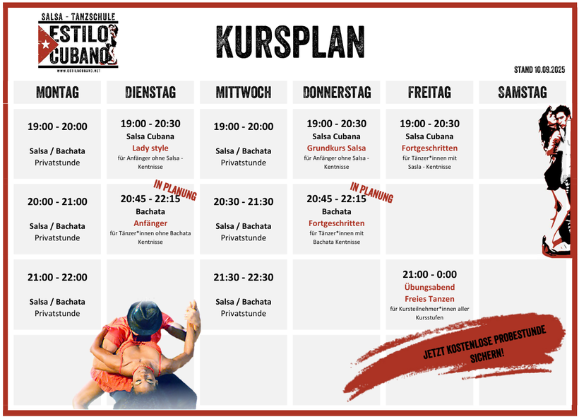 In allen Kursen kann gerne je nach Tanzerfahrung Gratis 1 Stunde geschnuppert werden.